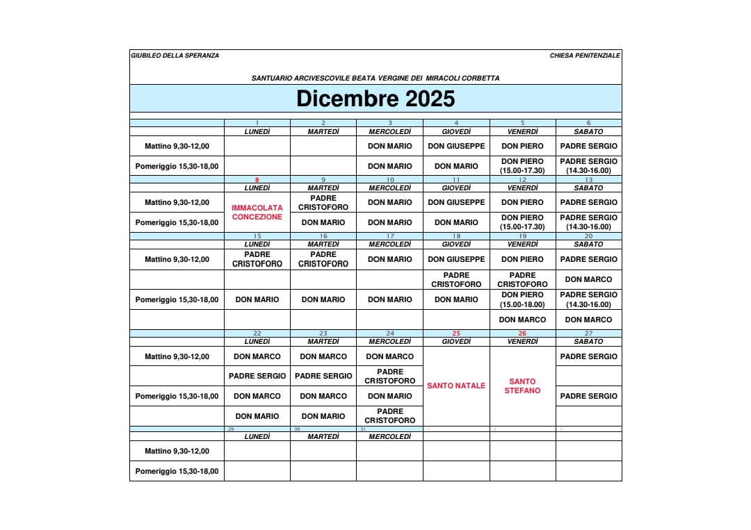 Per aiutare le persone a celebrare bene e con frutto il Sacramento della Misericordia, che perdona il peccato e fa nuovo il cuore con la Grazia del Sacramento, saranno indicati i nomi dei Sacerdoti confessori e l’orario preciso delle confessioni.
